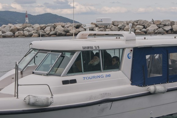 Из монастыря Ватопеда полиция сопровождает игумена Ефрема на катере на Иериссос.