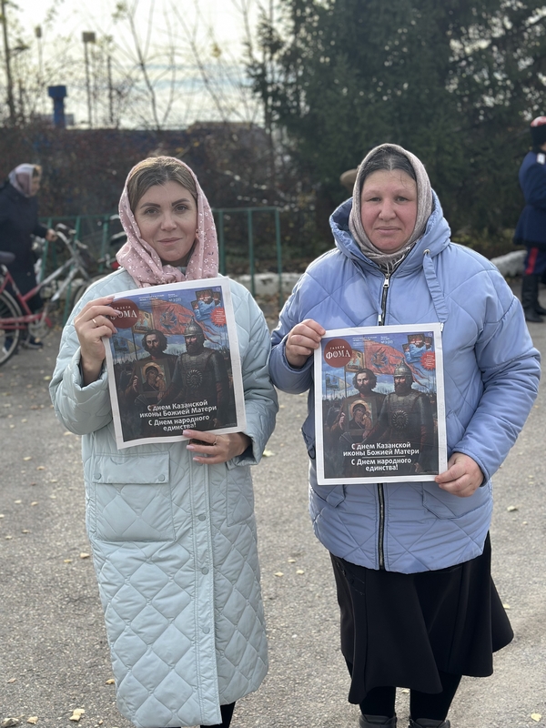 Каждому участнику крестного хода дарили праздничный номер православной газеты «Фома» и икону Казанской Божией Матери — как духовное напоминание о великом дне и покровительстве Пресвятой Богородицы.
