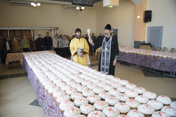 Освящение куличей совершил благочинный Добринского ЦО, настоятель Никольского храма п. Добринка протоиерей Александр Адоньев в кафе «Молодежное». Под пение воскресного тропаря 2-го гласа: "Егда снизшел еси к смерти, Животе Безсмертный..." отец Александр окропил куличи святой водой.