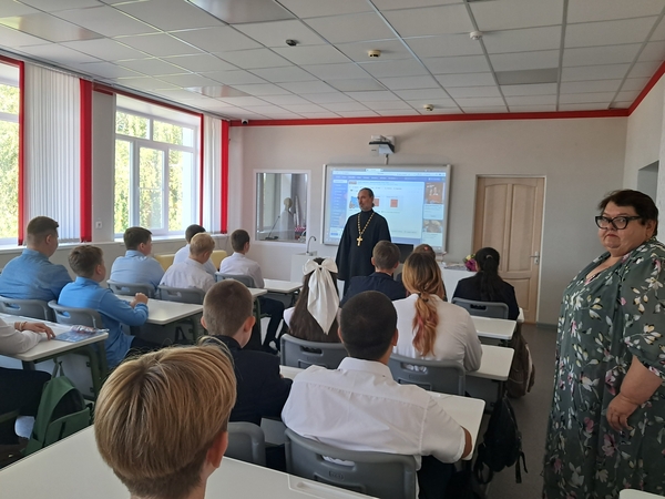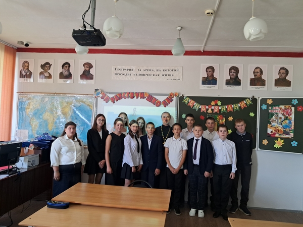 Благочинный Добринского ЦО, настоятель Никольского храма п. Добринка протоиерей Александр Адоньев посетил в этот день МБОУ СОШ №2 п. Добринка, которую он постоянно окормляет и где является частым и желанным гостем.